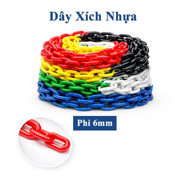 - Dây xích nhựa phi 6mm là thiết bị hỗ trợ phân luồng, cảnh báo an toàn, thường được sử dụng kết hợp với trụ cọc tiêu, trụ chắn inox hoặc hàng rào di động. Dây được làm từ nhựa PE cao cấp, màu sắc nổi bật (đỏ – trắng, vàng – đen, đỏ – vàng…), giúp cảnh báo từ xa hiệu quả. Với đường kính 6mm, dây đủ độ chắc chắn nhưng vẫn nhẹ, dễ mang theo, dễ lắp đặt và tháo gỡ.