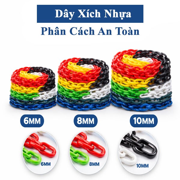 - Dây xích nhựa phi 8mm là thiết bị phân luồng an toàn được sử dụng rộng rãi trong giao thông, công trình và các khu vực cần khoanh vùng nguy hiểm. Sản phẩm có dạng mắc xích đều, làm bằng nhựa PE/PVC bền chắc, kết hợp các màu cảnh báo rõ ràng như đỏ - trắng, vàng - đen, đỏ - vàng. Với đường kính lớn hơn dây 6mm, dây xích phi 8mm có độ chắc chắn cao hơn, phù hợp cho không gian ngoài trời, nơi có gió lớn hoặc yêu cầu độ bền cao.