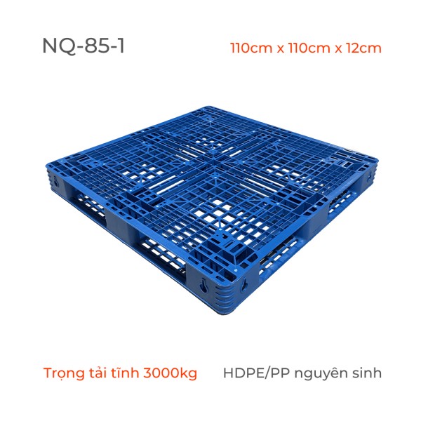 1. Chất liệu nhựa Nguyên Sinh 100% – Thách thức thời gian: Sử dụng hạt nhựa tinh khiết giúp NQ-85-1 có độ đàn hồi xuất sắc, chịu va đập mạnh không lo giòn gãy. 2. Khả năng chịu tải "Khủng" – An tâm kê hàng nặng: Gánh vác tải trọng tĩnh lên tới 3 tấn và tải trọng động 1 tấn, tự tin nâng đỡ máy móc, hóa chất, linh kiện kim loại. 3. Thiết kế mặt bích liền khối – Vững chãi, không cong vênh: Triệt tiêu hoàn toàn rủi ro võng, lún hoặc sập hàng khi kê lót dài ngày nhờ kết cấu đúc đồng nhất. 4. Kích thước "Vàng" 110x110cm – Tối ưu không gian Container: Vừa vặn hoàn hảo với các thùng container ISO (20ft, 40ft), cắt giảm đáng kể cước phí logistics quốc tế. 5. Kháng nước & Mối mọt – Chuẩn vệ sinh công nghiệp: Bề mặt trơn láng, không thấm nước, dễ xịt rửa và đáp ứng tốt các tiêu chuẩn kiểm dịch khắt khe.