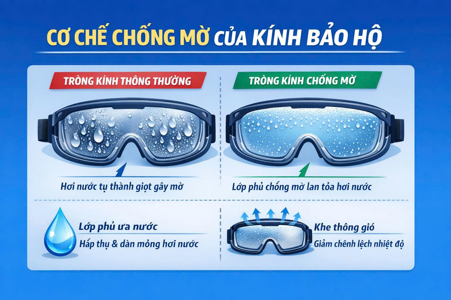 Một nguyên nhân khác là độ kín của kính bảo hộ. Nhiều mẫu kính được thiết kế ôm sát để ngăn bụi và dị vật, nhưng nếu không có hệ thống thông gió hợp lý, luồng khí nóng và ẩm bên trong kính không được thoát ra ngoài. Điều này khiến hơi nước tích tụ và nhanh chóng tạo sương mờ trên bề mặt tròng kính.